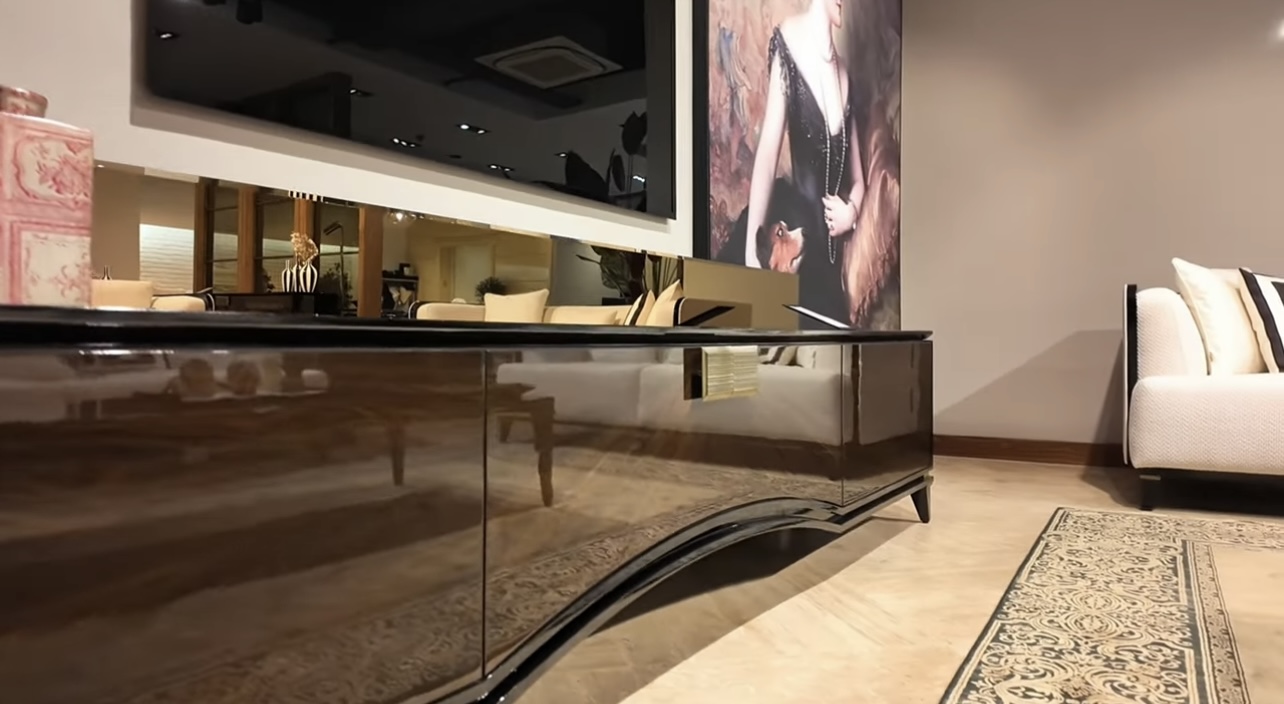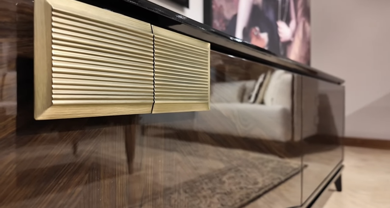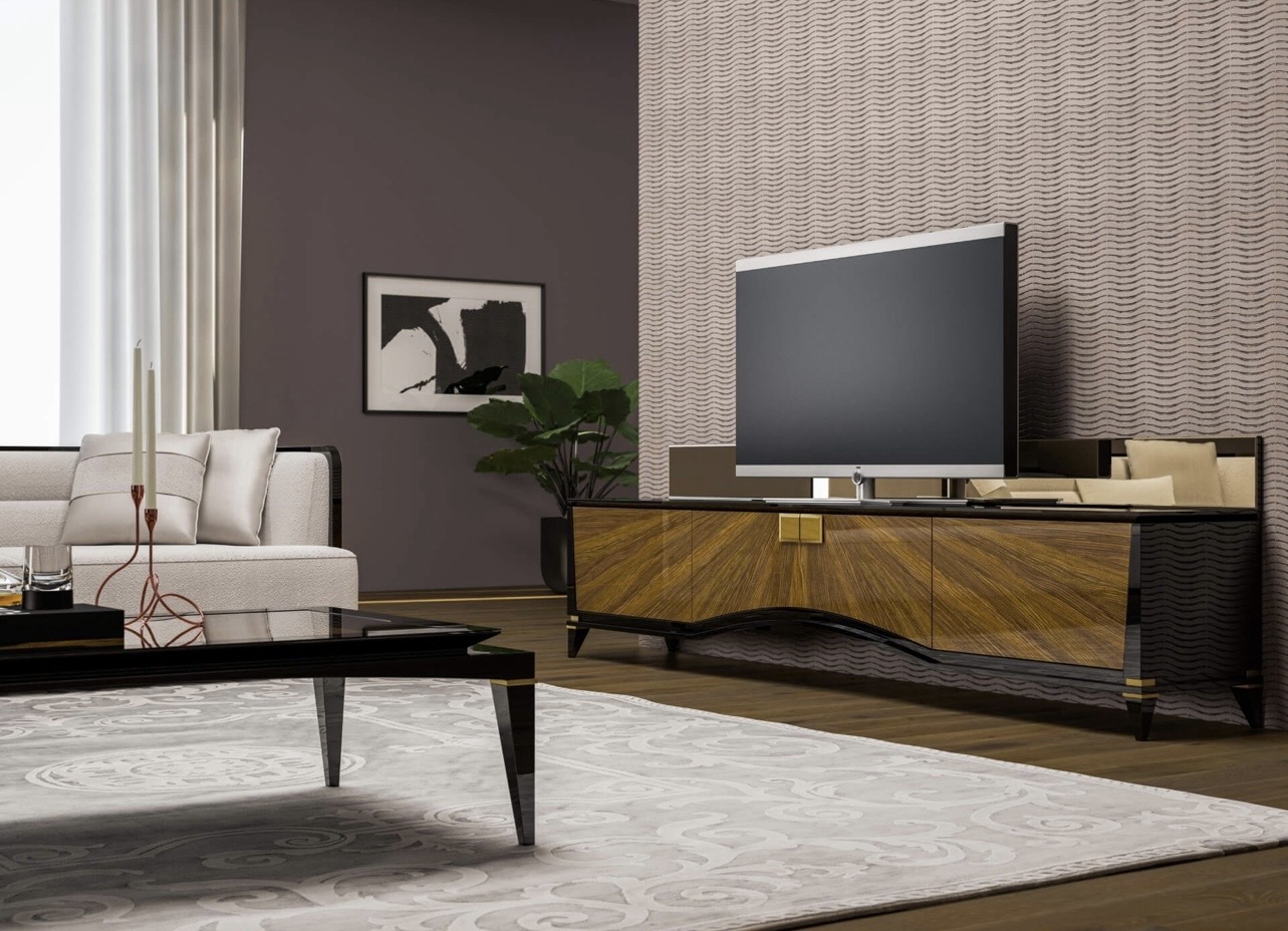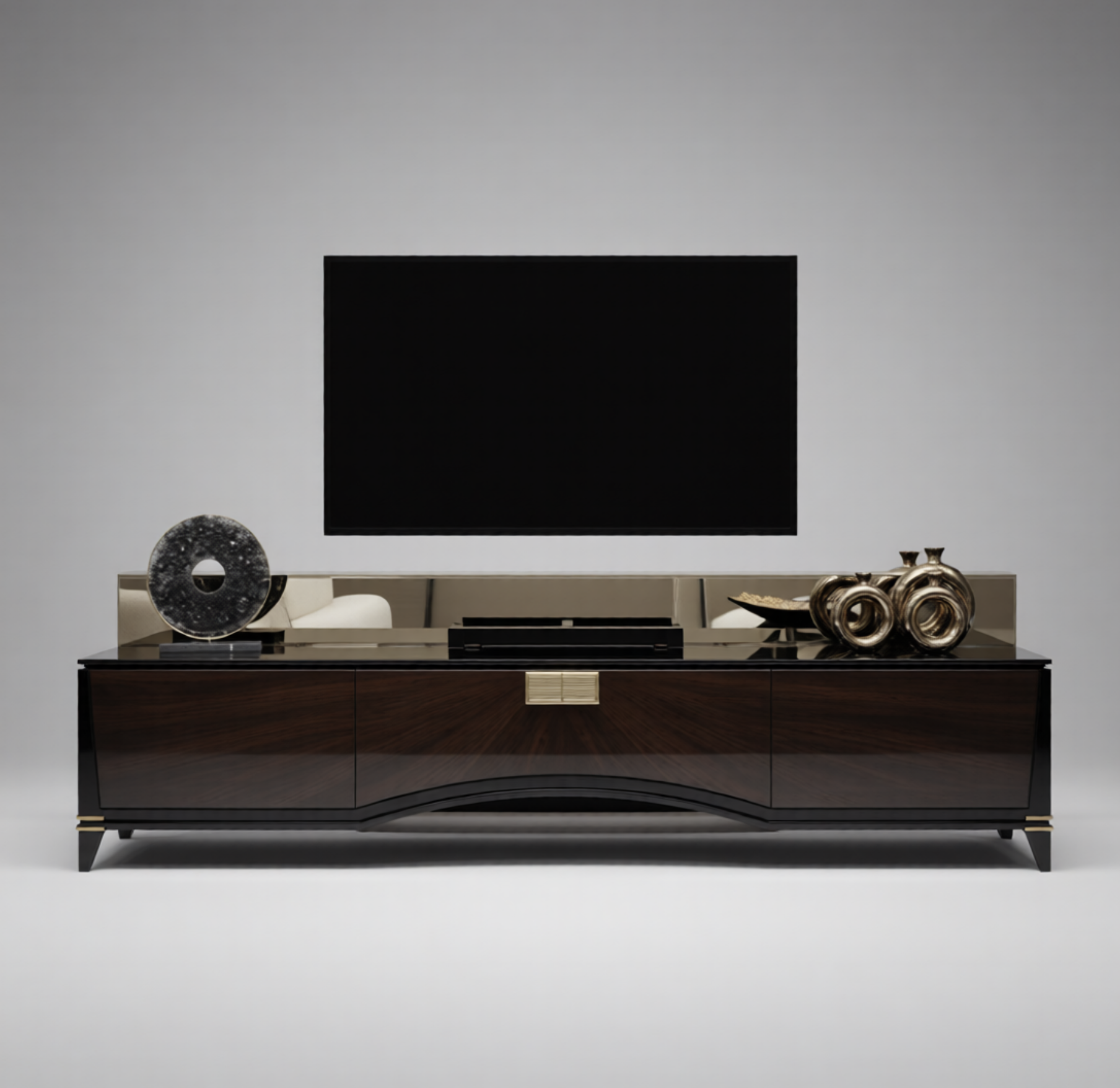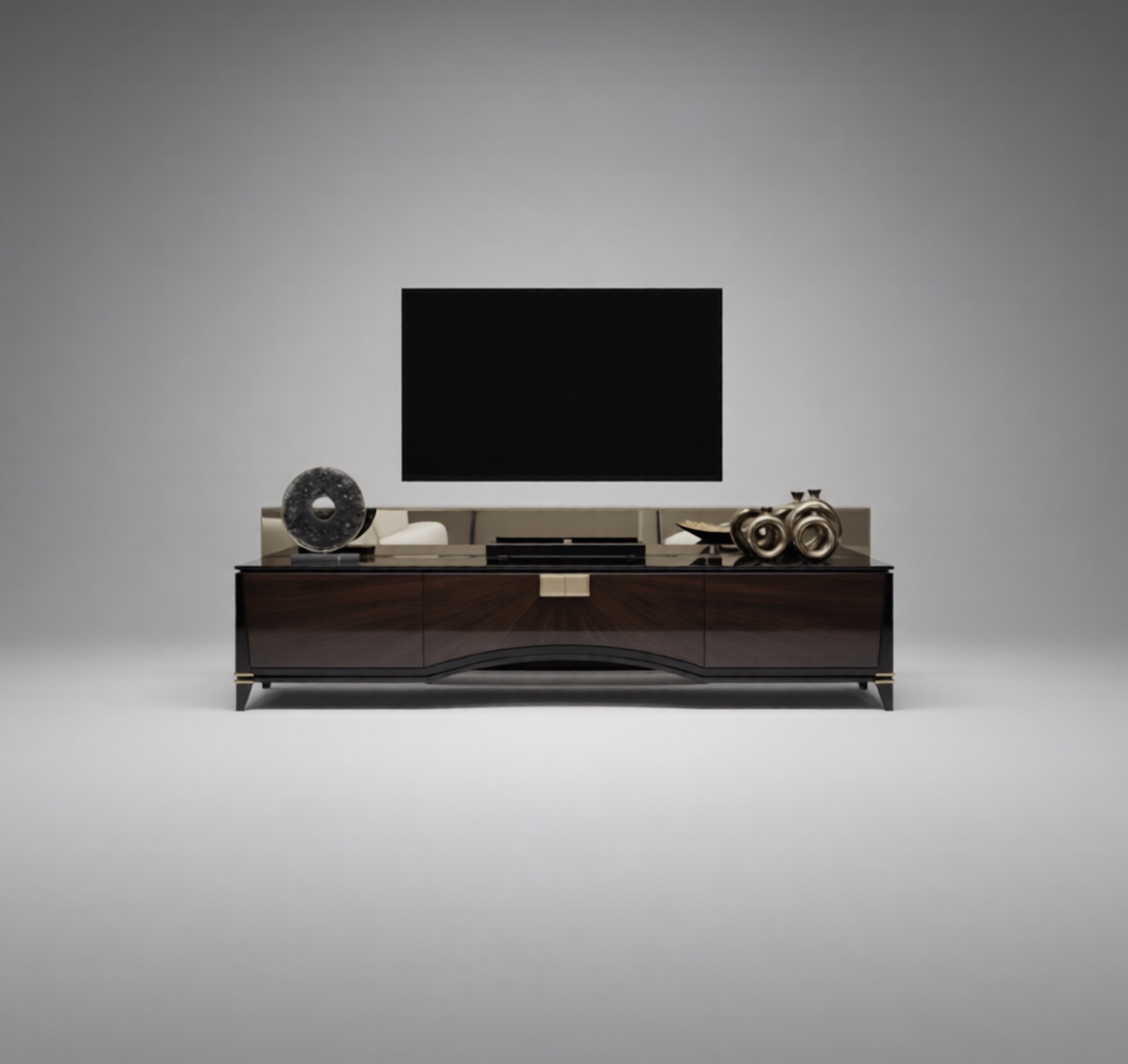 Discover our luxury “Kenza” TV unit crafted from premium materials, blending timeless elegance with modern functionality. Featuring exquisite wood veneers, brushed metal accents, and hand-polished finishes, designed to elevate, this statement piece combines artistry and practicality with unmatched sophistication.