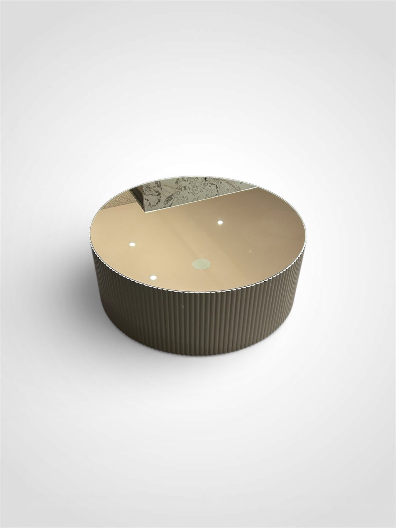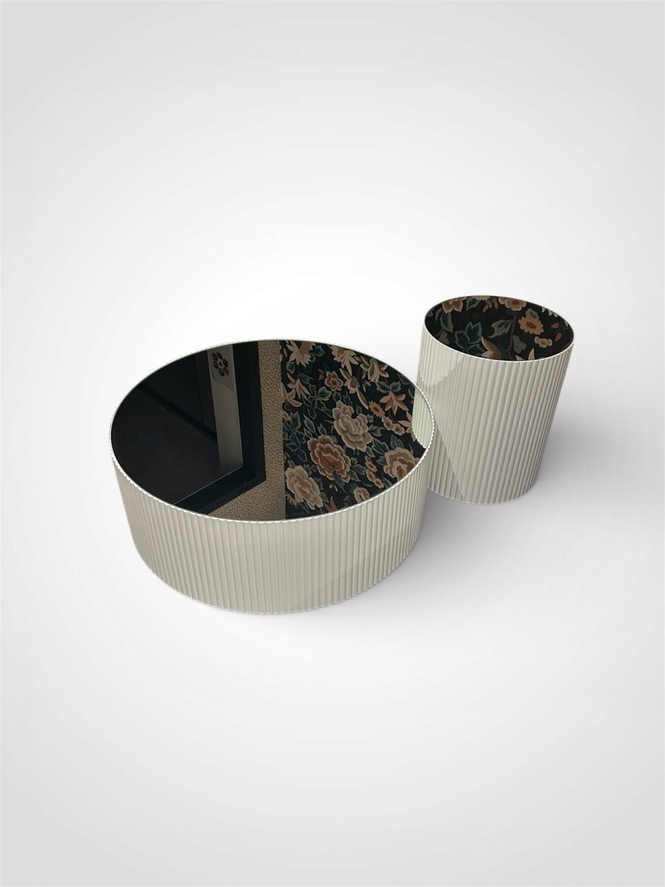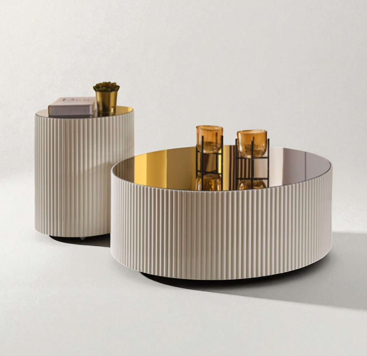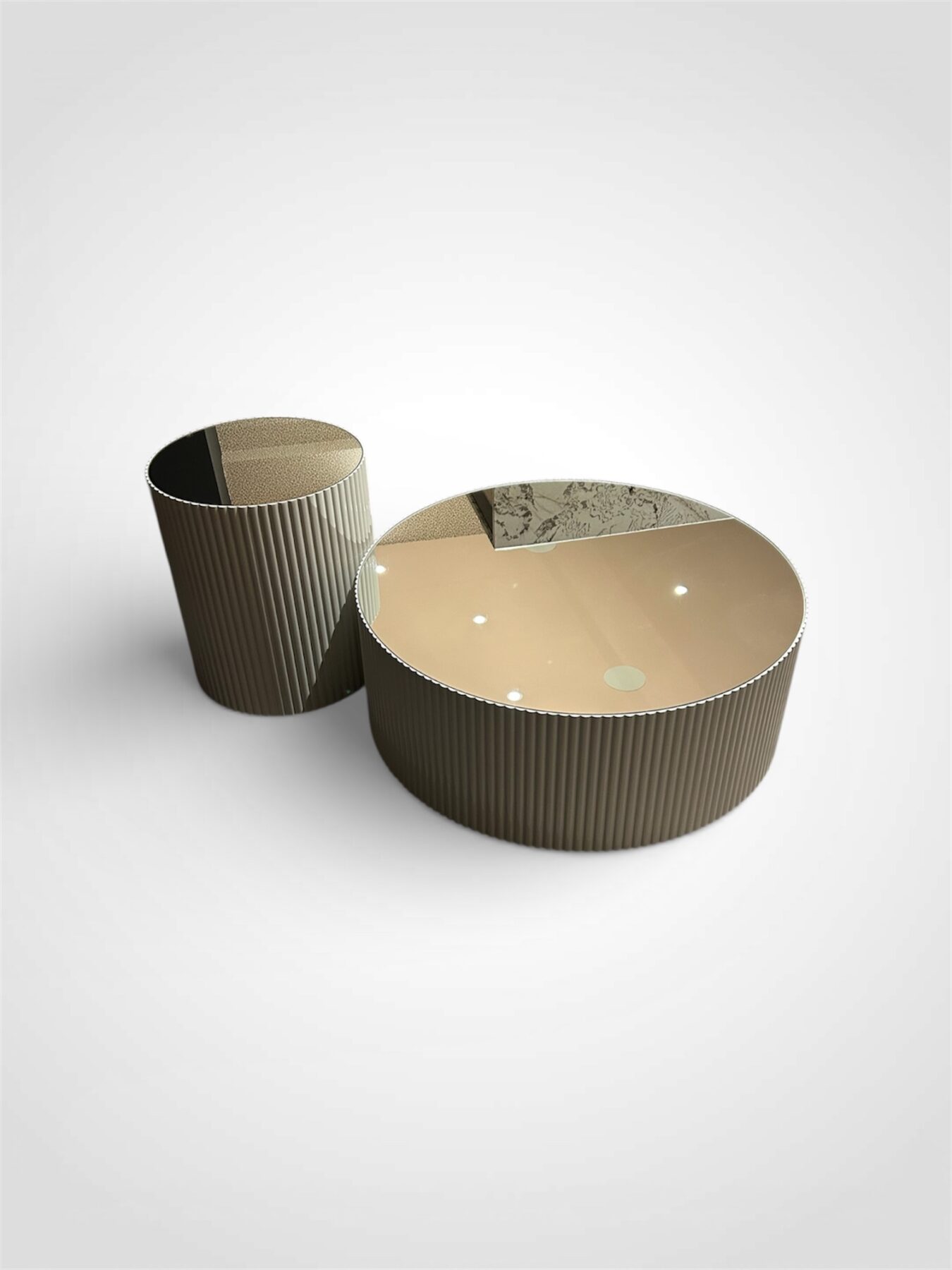 The versatile “Novia” set features a sleek round coffee table paired with a matching side table, designed with mobility and style in mind. Each piece boasts a unique combination of tabletop finishes—ranging from rich wood grains to smooth shiny surfaces. Built-in wheels ensure effortless movement, making it easy to rearrange or reposition as needed. A perfect blend of function and contemporary design.