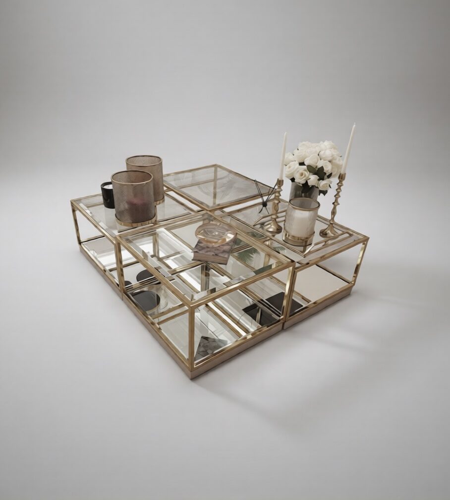 The Parma luxury coffee table features a sleek, modern design with a crystal-clear tempered glass top, elegantly supported by polished Titanium steel legs. The minimalist aesthetic and high-quality materials make it a stunning centrepiece for any sophisticated living space, seamlessly blending form and function.