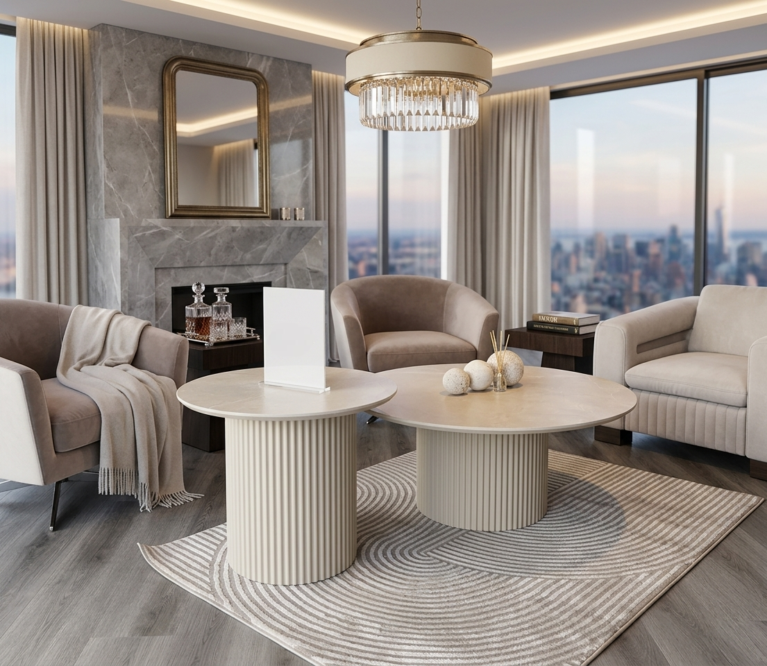 Elevate your space with the “Riyadh” trending coffee table set, featuring a marvellous beige top that exudes timeless elegance. Crafted with precision and sophistication, its sleek surface radiates warmth and refinement.