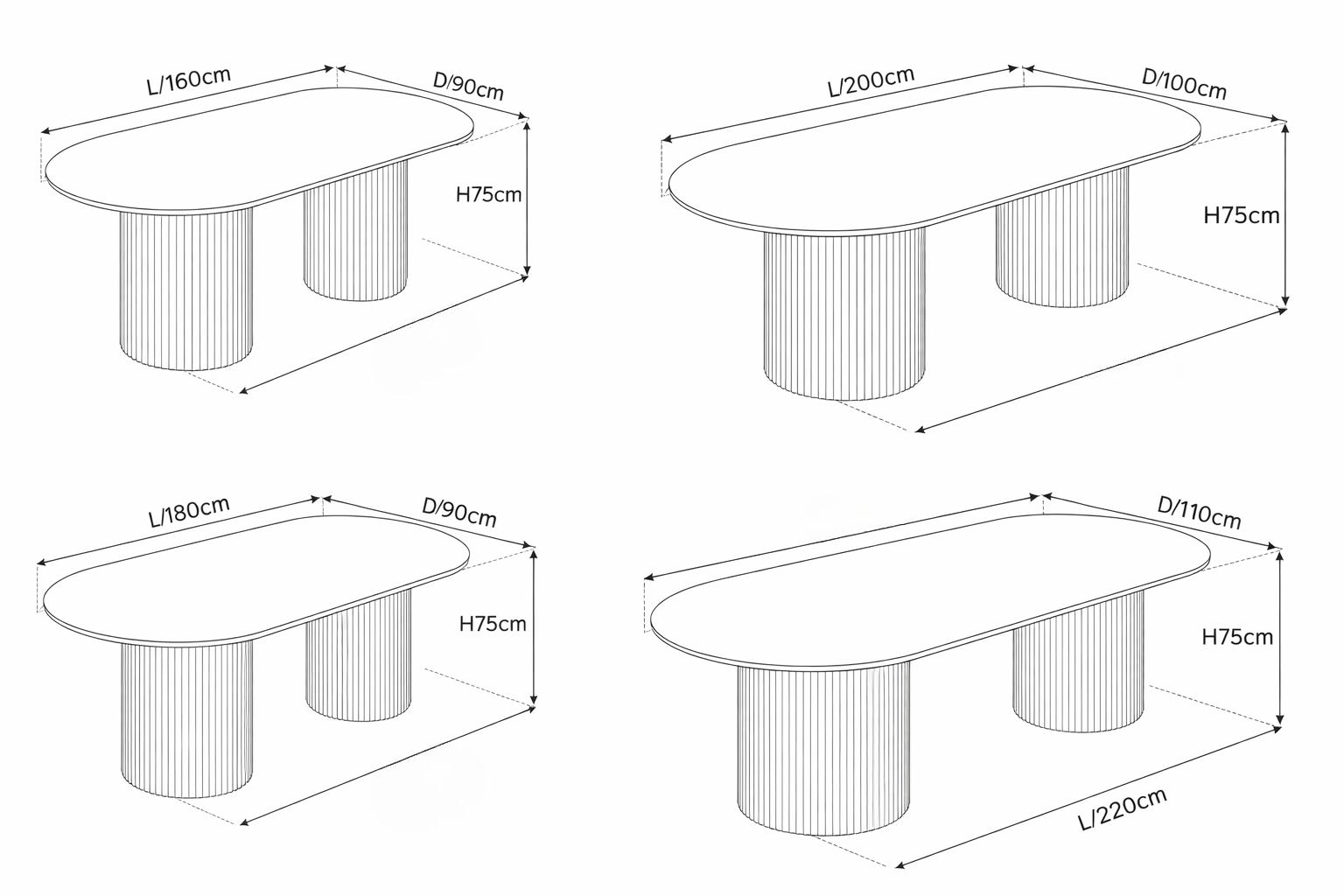 L/160cm x H/75cm x D/90cm, L/200cm x H/75cm x D/100cm, L/180cm x H/75cm x D/90cm, L/220cm x H/75cm x D/110cm, Round Table (120cm x 120cm x 75cm)