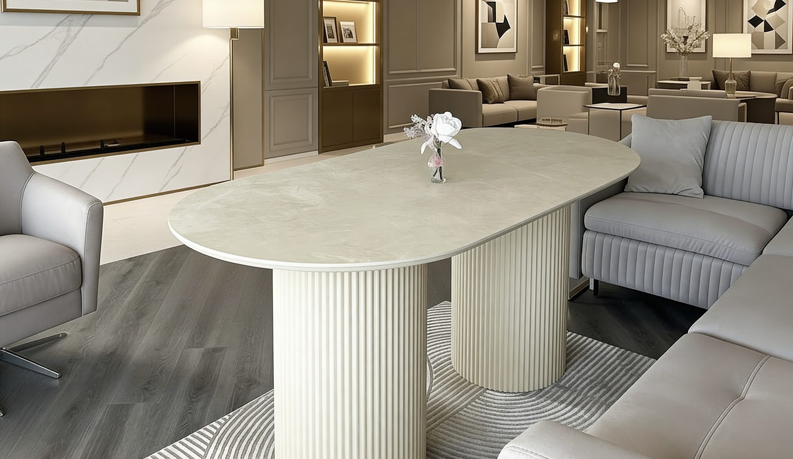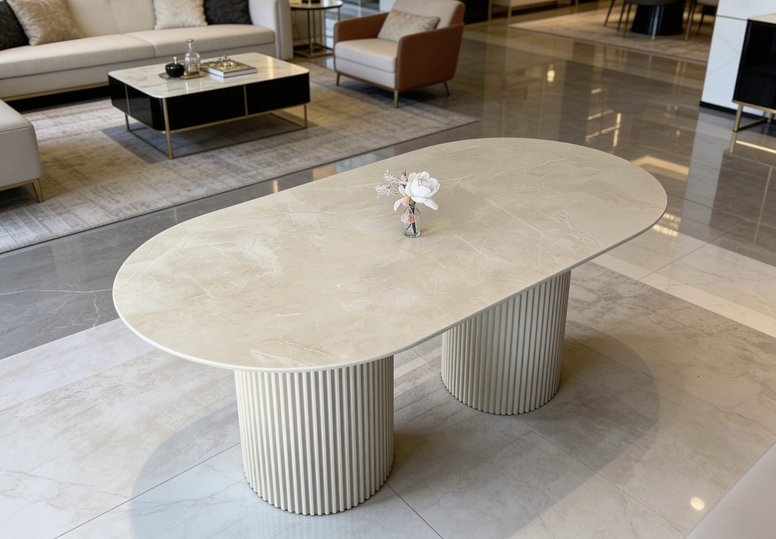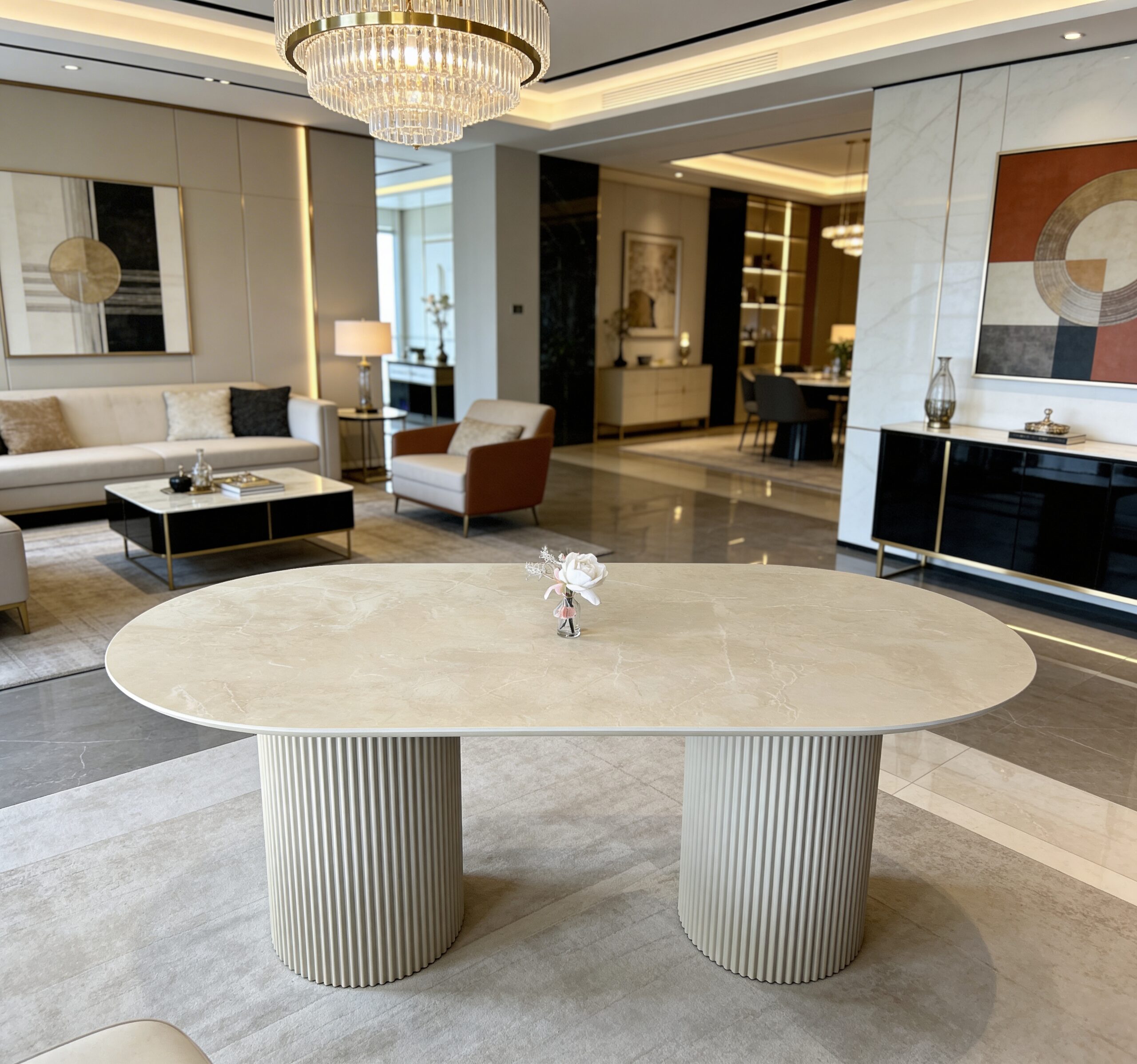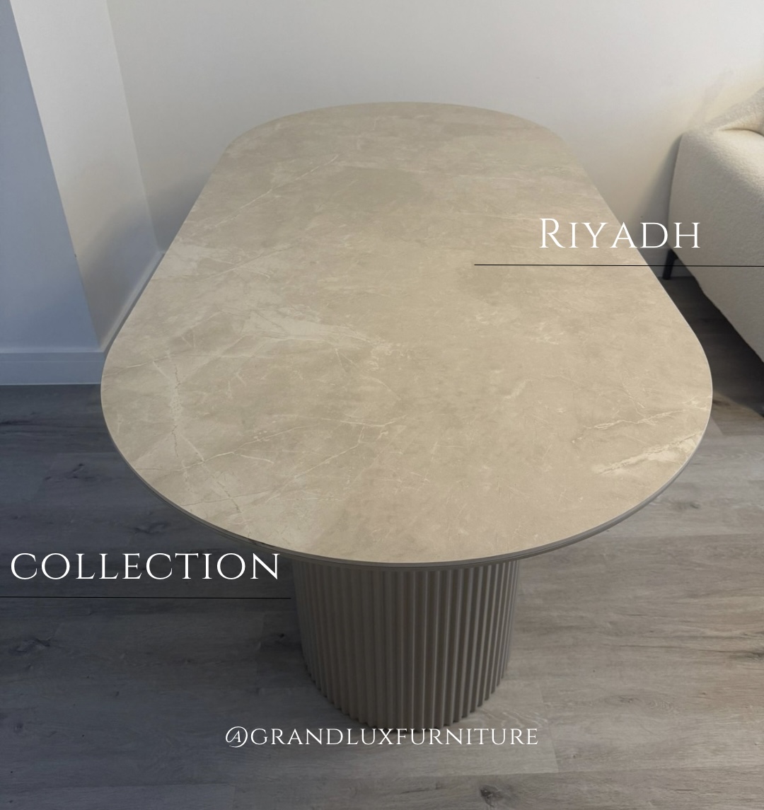 Elevate your space with the “Riyadh” exquisite luxury dining table, featuring a marvellous beige top that exudes timeless elegance. Crafted with precision and sophistication, its sleek surface radiates warmth and refinement.